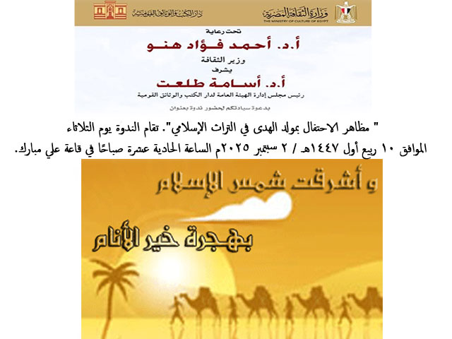 " مظاهر الاحتفال بمولد الهدى في التراث الإسلامي". تقام الندوة يوم الثلاثاء الموافق ١٠ ربيع أول ١٤٤٧هـ /